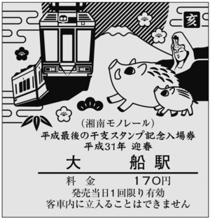 駅窓口で販売しておりました「平成最後の干支スタンプ記念入場券」につきましては、2019年5月20日(月)をもちまして、販売を終了させていただきました。多くのお客様にお求めいただき誠にありがとうございました。