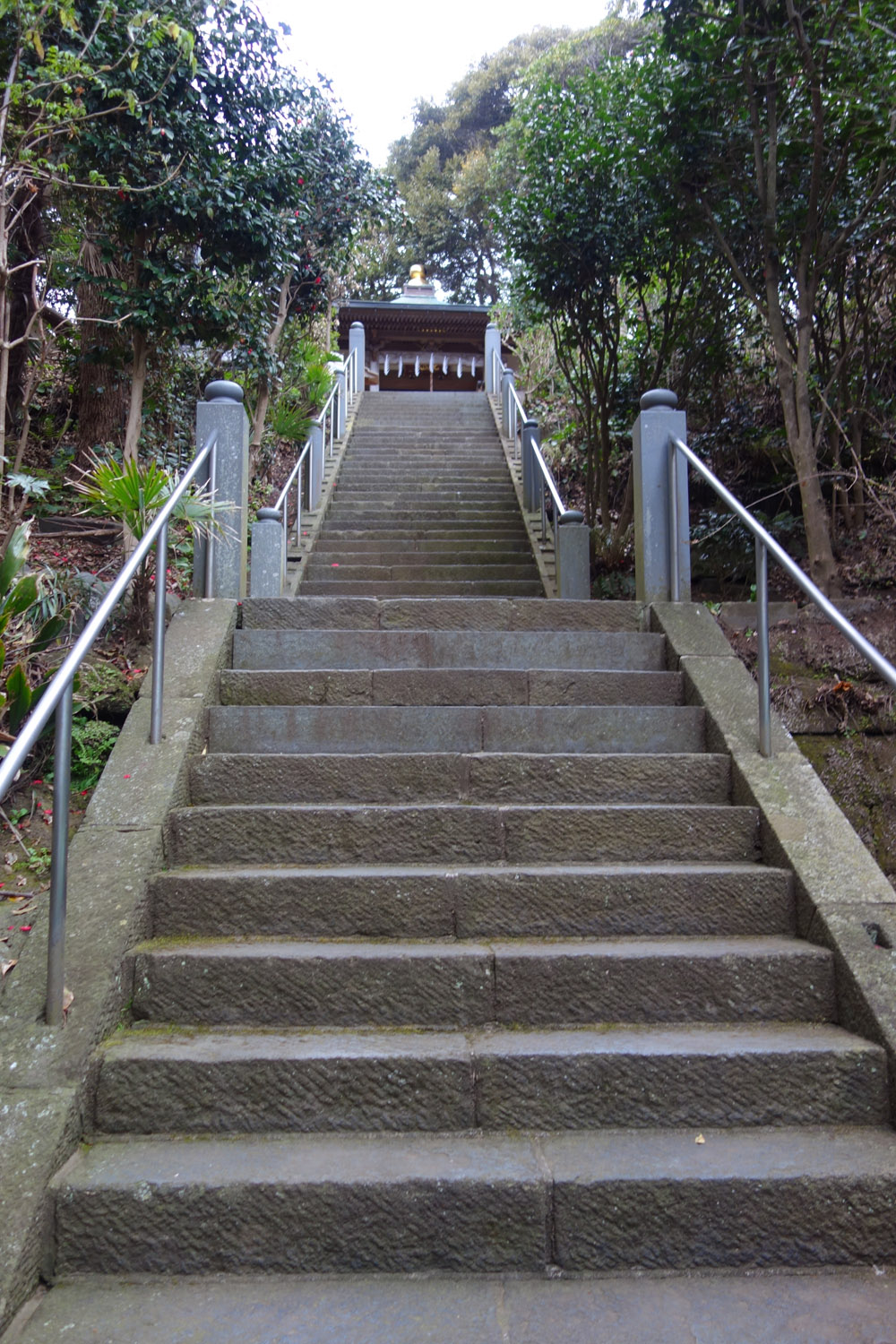 2回目の訪問でも最後まで辿りつけなかったので、3月中旬にもういちど訪れた。3回目は片瀬山駅からスタート。このエリアも津西2丁目、腰越5丁目などに魅力的な階段がいくつかあるが、全てを紹介するときりがないので、ここでは津西2丁目の急階段と、腰越5丁目のS字型階段、そして終点の湘南江の島駅近くにある龍口寺境内の階段を挙げる。